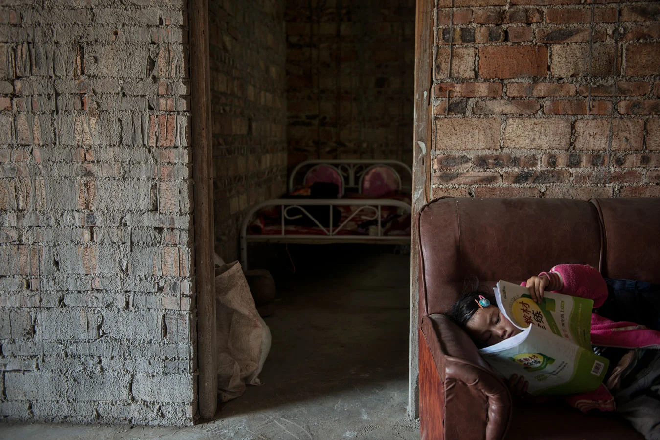 Hailian's little sister Haili, reading a school book in the newly built family home. Her parents just came back two days before, to work on the village road. Outside Chinese New Year she never sees her parents who work in a factory in Guangdong prov